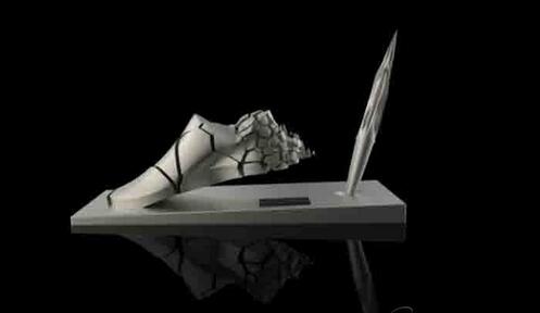 隨著3D打印的出現以及被廣泛應用,一大批優(yōu)秀的設計師將一件件極具藝術美感的設計作品精確形像地還原于觀眾的視線。這件極具藝術設計感的跑鞋臺牌作品是國內著名的美女設計師宋波紋設計的一款商務禮品,鞋子的造型表達的是關于速度,在奔跑的時候產生形象延時的感覺,裂變的重復排列讓鞋子帶有一定的力量感。而整體形象是一個動態(tài)的靜幀,動靜結合,讓小雕塑穩(wěn)重、生動。