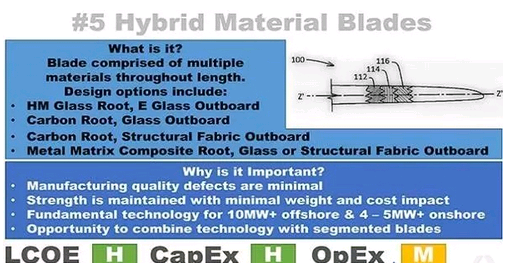 運用混合材料的基本理念是在風力渦輪片的不同受力點的地方采用不同質量和密度的材料,這樣可以減少風力渦輪片的總重量,同時加固風力渦輪片的整體結構。現有的案例包括運用高模量玻璃或是碳纖維來制造渦輪片的網狀結構和根部——這些地方的受力更多,同時用一般的玻璃來生產外部結構。這樣一來可以節省成本,優化現有的基礎設施,充分利用創新科技。