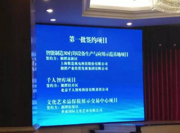 會議的簽約儀式中,上海數造機電科技股份有限公司作為第一家簽約公司,將在湘潭市高新區(qū)智造谷,成立3D打印設備生產及示范應用基地(擬成立湖南數造公司),總投資為3000萬元。將以3D打印設備生產、3D掃描及打印服務、3D設備應用示范、3D學院(3D教育)、行業(yè)云平臺服務為主要職能。
