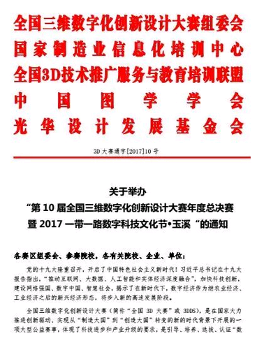 第10屆全國(guó)三維數(shù)字化創(chuàng)新設(shè)計(jì)大賽年度總決賽暨2017一帶一路數(shù)字科技文化節(jié)定于2017年12月6日至12月9日在云南省玉溪市盛大舉辦。“數(shù)造杯”數(shù)字化創(chuàng)意設(shè)計(jì)與智能制造(3D打?。┐筚?/strong>作為主活動(dòng)之一,將于12月6日-12月9日同期舉行。現(xiàn)將相關(guān)活動(dòng)具體安排通知如下: